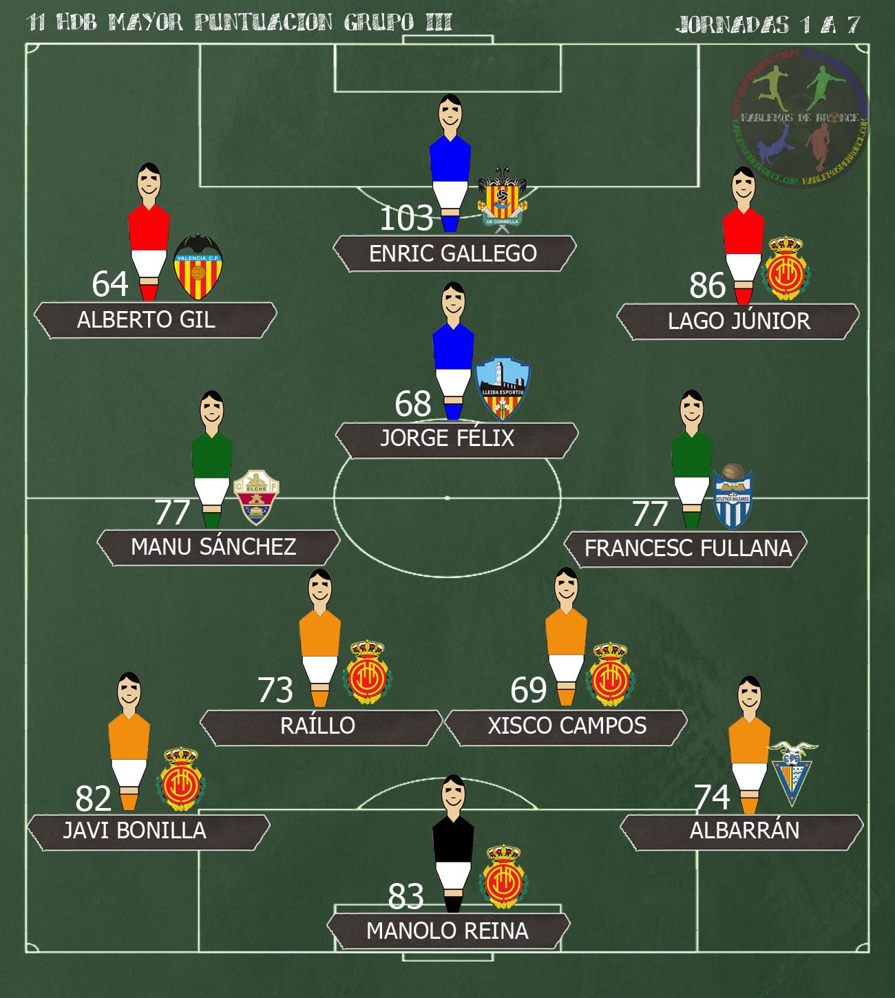 DLSH7YoW4AAMzmB.jpg-largeAquí tenéis el once ideal de las siete primeras jornadas según los compañeros de “hablemos de bronce”. Cinco jugadores del Mallorca, uno del Elche, otro del Badalona, otro del Atlètic Balears, otro del Cornellà, otro del Valencia B y un último del Lleida. ¿Es el mejor equipo de la categoría? A mí me parece muy aproximado.