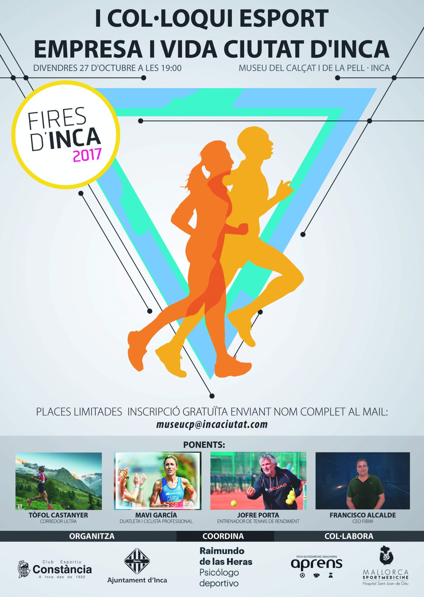El VIERNES 27 DE OCTUBRE A LAS 19:00 EN EL MUSEU DEL CALÇAT I LA PELL D’INCA tendrá lugar el “1er Col.loqui Esport, Empresa i Vida Ciutat d’Inca” organizado por el CE Constància y el Ajuntament d’Inca y coordinado por el responsable del departamento de psicología del Club, Raimundo de las Heras, enmarcado dentro de los actos de “Les Fires 2017” en concreto en la “Fira de l’Esport” y gracias a la colaboración de “Aprens” de Inca y de “Mallorca Sport Medicine” del Hospital Sant Joan de Déu de Palma de Mallorca.