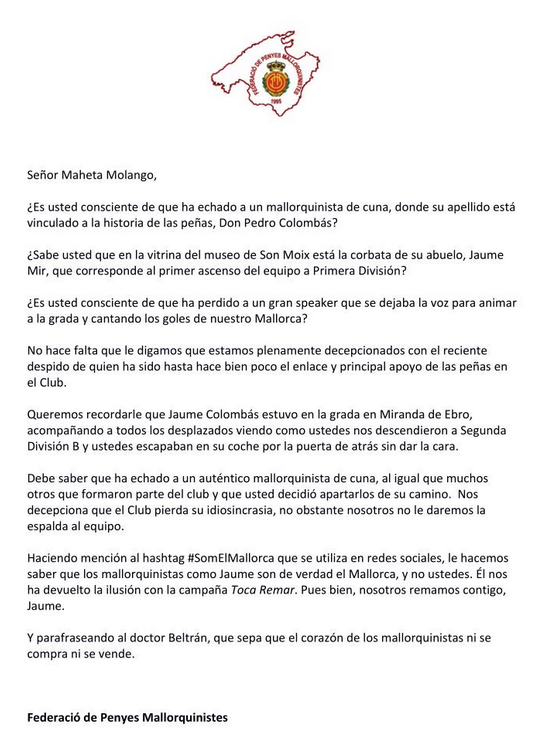 La federación de Penyas del Mallorca ha remitido el siguiente escrito a Maheta Molango en referencia al despido de jaume ColombasÂ