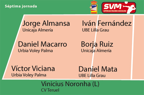 El encuentro entre almerienses y baleares por la cabeza de la tabla no sólo catalizó la atención de la jornada sino que se refleja en el siete ideal de la jornada, con cuatro jugadores procedentes de este encuentro entre los destacados. Además de Víctor Viciana entra entre los elegidos el central Daniel Macarro que fue uno de los más acertados en su puesto al firmar 5 bloqueos y 15 puntos.