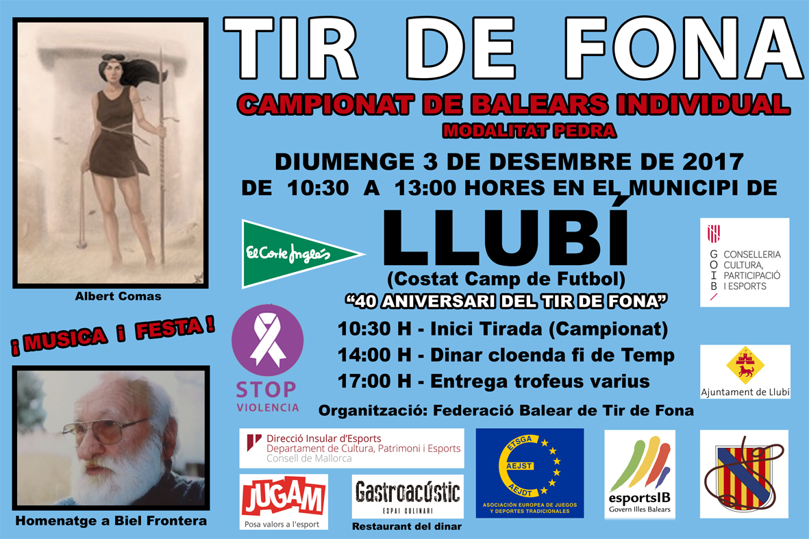 La Federacion Balear de Tir de Fona, con el patrocinio del Govern Balear, El Corte Ingles, y la colaboración del Ayuntamiento de LLubi, han organizado el XXXVI Campeonato de Baleares 2017, que se ha disputado en el poliesportiu de LLubi, el dia 3 de diciembre, a las 10,30 horas, sobre las habituales distancias de 15 i 30 passes nins i dones i 30 i 45 passes els homes federats.