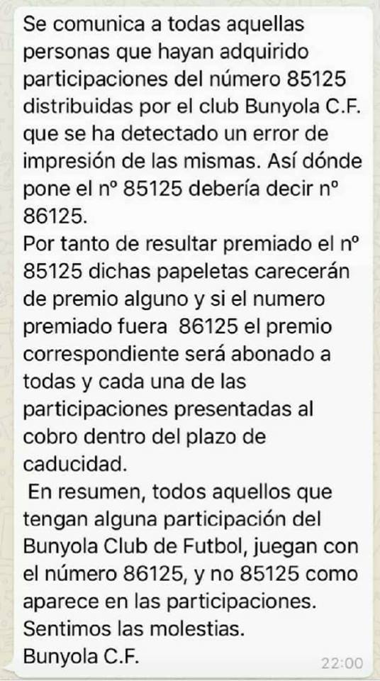 La Directiva del bunyola nos hace llegar esta rectificación en cuanto a la Loteria de navidad que ha vendido el club.