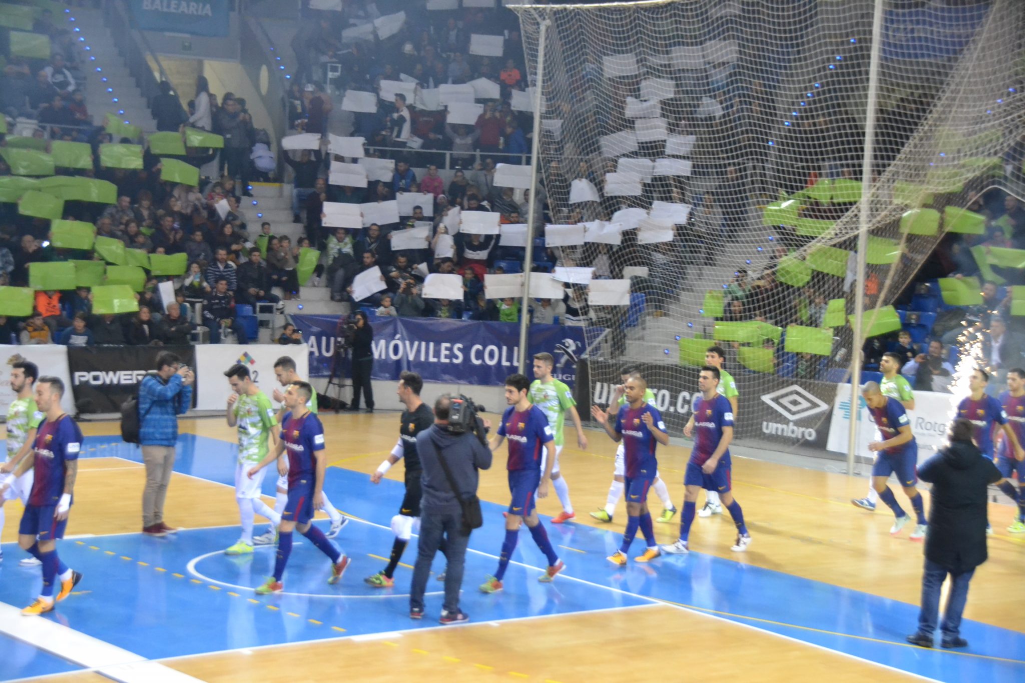 Los mallorquines no se arrugaron en los primeros compases del partido y aunque las primeras ocasiones fueron por parte de los blaugranas, los hombres de Vadillo reaccionaron y llegaron en varias ocasiones a la meta que defendÃa Paco Sedano. Las mejores ocasiones pasaban por las botas de Felipe Paradynski, que no conseguÃa batir al portero rival. La insistencia local tuvo su premio pasado el ecuador de la primera mitad y un gran pase de Tomaz lo aprovechaba Diego Quintela casi sobre la lÃnea de gol para empujar el balón al fondo de la porterÃa e inaugurar el marcador ante la locura de los 4.000 aficionados que abarrotaban el Palau Municipal d’Esports de Son Moix (1-0).