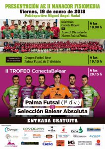 El conjunto de Primera División jugará un partido amistoso ante la Selección Balear tras la presentación de la cantera del club en Manacor en el II Trofeo ConectaBalear de fútbol sala. Será una tarde intensa de fútbol sala con el protagonismo para la cantera. Tras jugar en Calvià a finales del mes pasado, el Palma Futsal vuelve a sus orígenes este viernes.