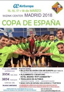 El club ha organizado un desplazamiento organizado para sus aficionados a la Copa de España de Madrid que se disputará del 15 al 18 de marzo. Puedes acompañar al equipo y ver toda la competición, la más espectacular de las organizadas hasta la fecha. El viaje incluye vuelos, hotel, traslados del aeropuerto al hotel y el bono para todos los partidos de la Copa de España.