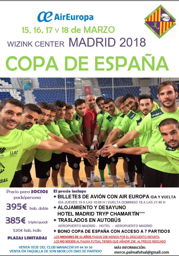 Cada vez son más los aficionados que quieren acompañar al equipo a esta gran cita nacional e internacional y el club pone en marcha un viaje organizado para facilitar el desplazamiento de todos los aficionados que quieran vivir en directo la fiesta del fútbol sala. El viaje incluye el avión de ida y vuelta con Air Europa, tres noches de hotel en régimen de alojamiento y desayuno, traslados del aeropuerto al hotel y el bono completo para asistir a los siete partidos que se jugarán en la Copa de España, todo por 395 euros en habitación doble. El precio es especial para los socios abonados del Palma Futsal aunque los no socios también pueden acceder a la promoción aunque añadiendo 25 euros más al precio establecido. Hay un precio más reducido para habitaciones múltiples. La ida será el jueves a las 10 de la mañana, día del estreno del Palma Futsal, que abrirá el torneo a las 19:00 horas. Para más información y reservas pueden llamar al teléfono 971.84.59.56. El Palma Futsal buscará el pase a las semifinales por primera vez en su historia ya que en las cuatro ediciones anteriores siempre cayó en los cuartos de final.