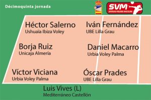 Dos jugadores del lÃder Urbia Voley Palma también entran en el siete ideal de la jornada. El central Daniel Macarro repite en el puesto del centro de la red tras sus 5 bloqueos mientras que VÃctor Viciana también es elegido nuevamente omo el colocador más destacado tras llevar a su equipo a un nuevo triunfo y aportar además 4 puntos, con 1 ace, 1 bloqueo y 48% de efectividad ofensiva colectiva.