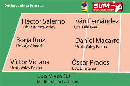 Dos jugadores del lÃder Urbia Voley Palma también entran en el siete ideal de la jornada. El central Daniel Macarro repite en el puesto del centro de la red tras sus 5 bloqueos mientras que VÃctor Viciana también es elegido nuevamente omo el colocador más destacado tras llevar a su equipo a un nuevo triunfo y aportar además 4 puntos, con 1 ace, 1 bloqueo y 48% de efectividad ofensiva colectiva.