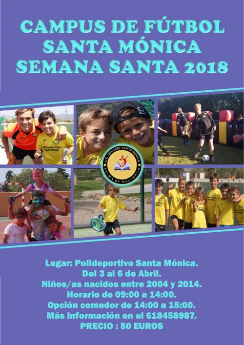 Tras el éxito de los anteriores campus, esta Semana Santa se vuelve a organizar un Campus de fútbol en el Polideportivo Santa Mónica, del 03 al 06 de abril de 2017 con el objetivo de siempre: que los niños y niñas aprendan disfrutando del fútbol.