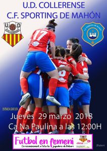 El proper dijous dia 29 (Dijous Sant), hi ha lliga a 2ª divisió nacional i aprofitant que durant tot aquest mes de març l’Ajuntament ha realitzat diferents actes per reconèixer a les dones esportistes, també desde el Club ens volem sumar, ja que rebem a un altre equip de les nostres illes, com es la Sporting de Maó, dedicarem aquest partit per reconèixer l’esforç que fan les jugadores de futbol, per donar-se a conèixer i fer-se un lloc dintre d’un esport que es majorità riament masculÃ.