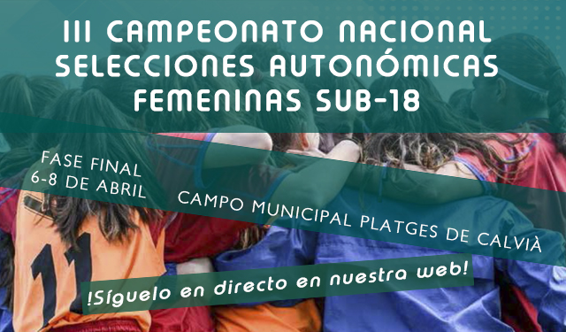 La localidad de Calvià en la isla de Mallorca acoge, del 6 al 8 del presente mes de abril, la Fase Final del Nacional de Selecciones Autonómicas Femeninas en categorÃa Juvenil, en la que la plantilla que dirige Santiago Triguero abrirá el fuego enfrentándose en semifinales a la anfitriona, Baleares. La cita será el próximo viernes, dÃa 6 de abril, a las 12:30 horas, y podrá ser seguida online gracias a la retransmisión televisiva vÃa ‘streaming’ que realizará la Real Federación Española de Fútbol, y que la FFCV ofrecerá a través de su web dándole cobertura asà para aquellas personas que no puedan desplazarse a las Islas Baleares a animar a la Selección Valenciana.