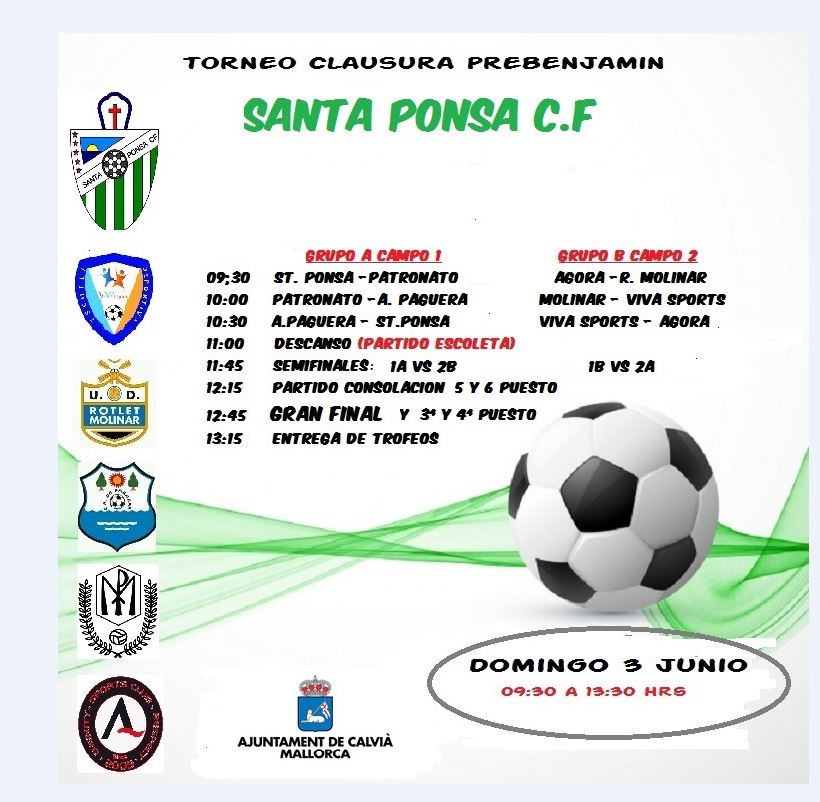 Este próximo Domingo 3 junio en el polideportivo municipal de Santa ponsa se celebrará la 1a edición del Torneo clausura Prebenjamin organizado por el Santa ponsa C.F.