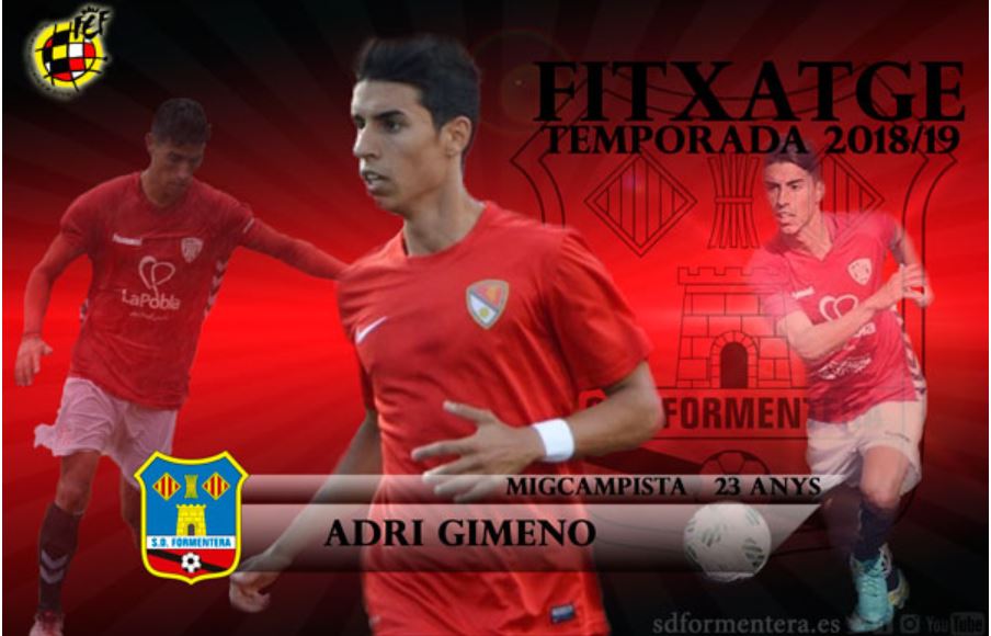 Adrián Gimeno Hernández “Adri” (Gavà, Barcelona, 25/03/1995), és nou jugador del primer equip de la SD Formentera. Es tracta d’un migcampista de 23 anys procedent de la Pobla de Mafumet, filial del Nàstic de Tarragona. Fútbol Pitiuso va avançar en exclusiva l’interès del club roig i negre pel futbolista divendres passat.