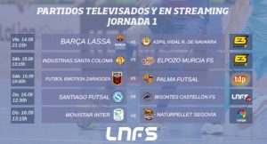 La Liga de Primera y Segunda División retorna este fin de semana después del parón estival.- Cuatro partidos de Primera División se podrán seguir por televisión: Barça Lassa – Aspil Vidal Ribera Navarra, Industrias Santa Coloma – ElPozo Murcia, Fútbol Emotion Zaragoza – Palma Futsal y Movistar Inter – Naturpellet Segovia. Además, por lnfsdirecto.es, se podrá ver el Santiago Futsal – Bisontes Castellón.
