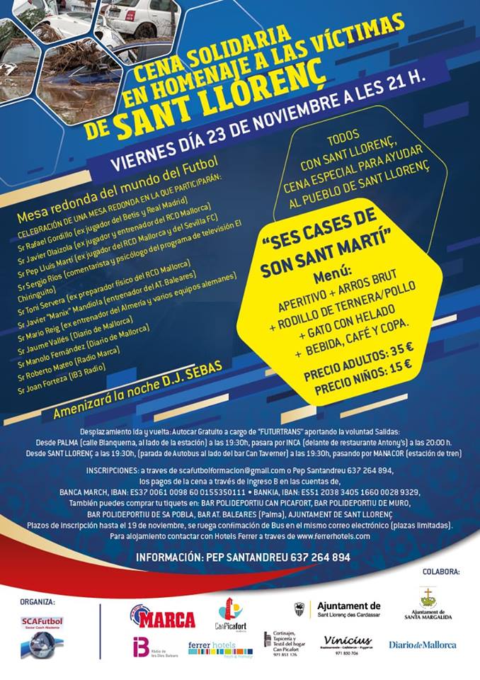 La cena, que se llevará a cabo en ‘Ses Cases de Son Sant Martí’ tiene un precio de 35 euros para los adultos y tan solo 15 para los niños. Para reservar plaza, pueden hacerlo a través del correo electrónico scafutbolformación@gmail.com o bien via telefónica a través del número 637 264894, y preguntar por Pep Santandreu, cabeza visible del Comité Organizador de esta Cena Solidaria, cuya recaudación irá de forma íntegra para ayudar las víctimas de la torrentada sufrida en Sant Llorenç el pasado 9 de Octubre.