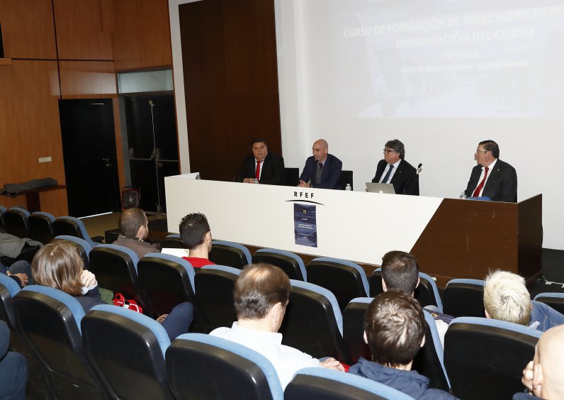 Luis Rubiales, presidente de la RFEF, Jacinto Alonso, directivo responsable de la formación RFEF, Pep Sansó, director de la Escuela Nacional de Entrenadores y José Bermejo, catedrático emérito de Derecho Administrativo de la Universidad de Zaragoza y profesor en el curso (ha participado en las 25 ediciones celebradas), han sido los protagonistas en el acto de inauguración.