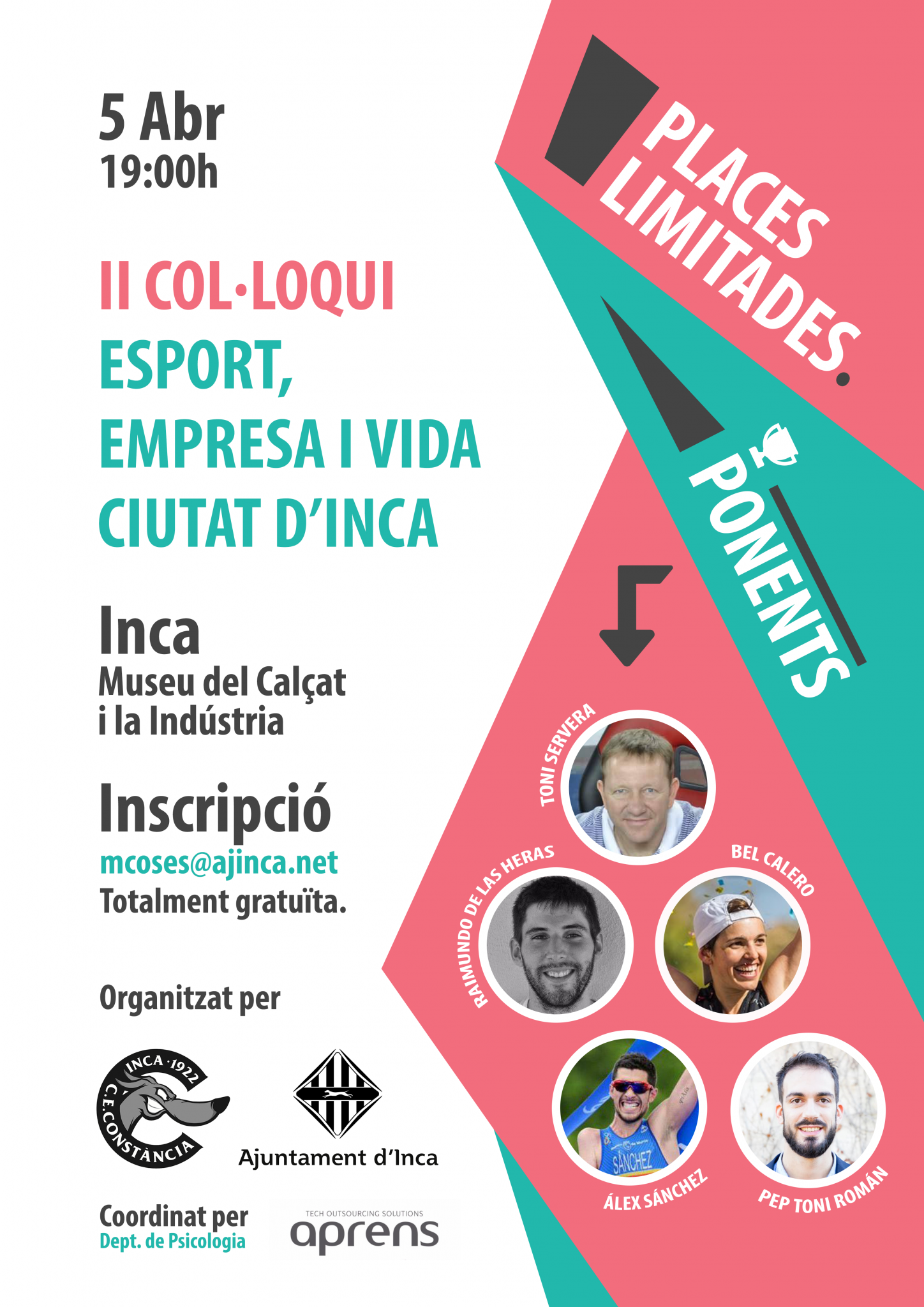 El CE Constància i l’Ajuntament d’Inca tornen a organitzar el “II Col•loqui ESPORT, EMPRESA I VIDA” que tindrà lloc el divendres 5 d’abril a les 19:00 al Museu del Calçat i la Indústria; cinc ponents de luxe ens faran passar un capvespre molt enriquidor amb les seves ponències relacionades amb el títol del esdeveniment: xerrades curtes, de no més de 12 minuts, però molt intenses i interesants. Tot coordinat pel departament de psicologia esportiva del CE Constància i el gabinet de psicologia “Aprens”; i gràcies al suport de l’Ajuntament d’Inca.