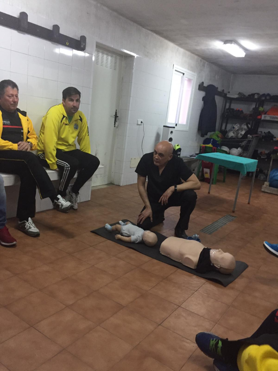 Un grupo de directivos,entrenadores, delegados y encargados del bar asistieron este lunes a una clase de repaso sobre el funcionamiento del desfibrilador combinado con primeros auxilios. Durante dos horas y media  el instructor en soporte vital båsico  y DESA Jose María Torres Rudilla explicó lo esencial para el buen manejo de un desfibrilador y los alumnos pudieron hacer pråcticas sobre ello, complementåndose con normas de primeros auxilios.