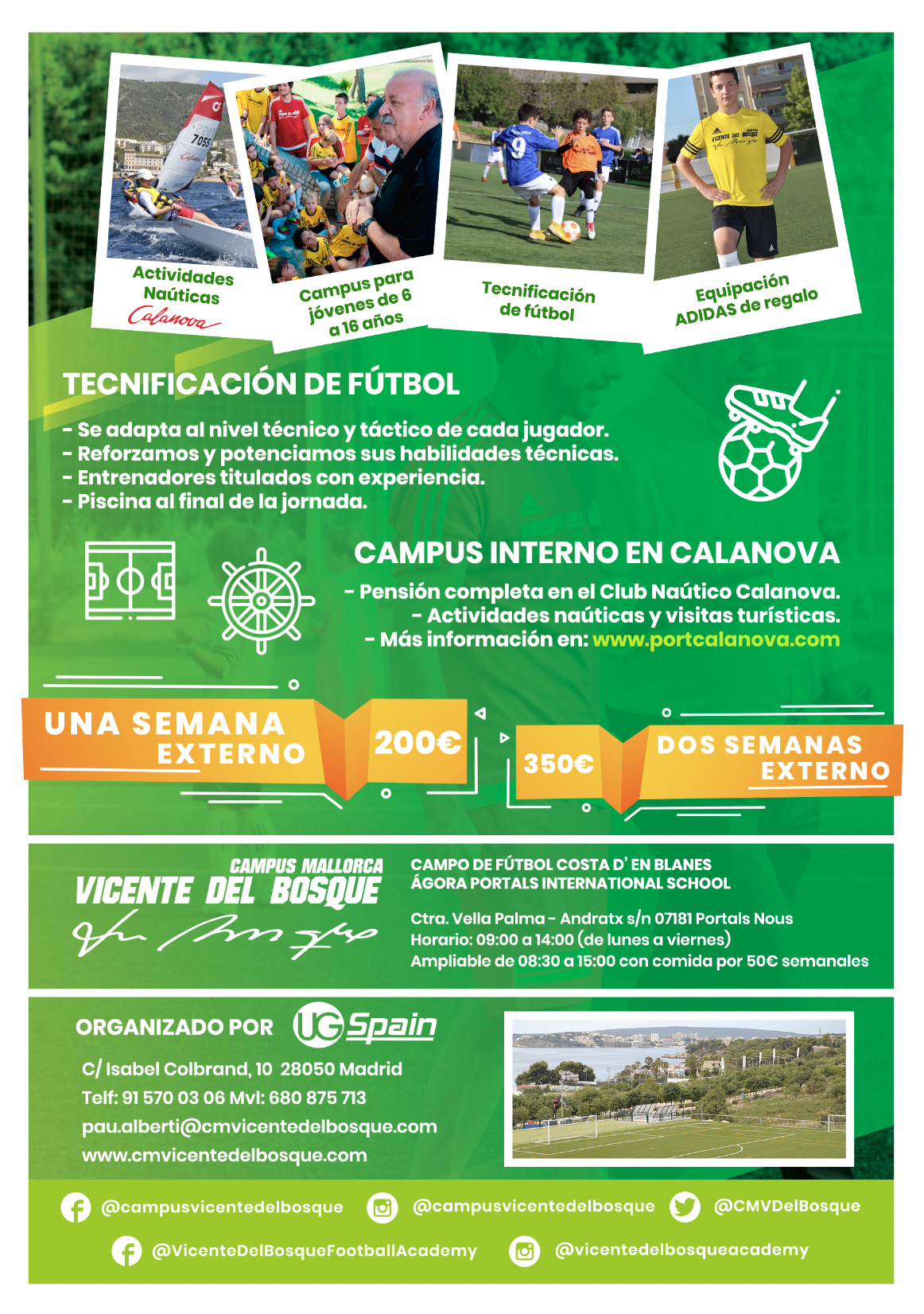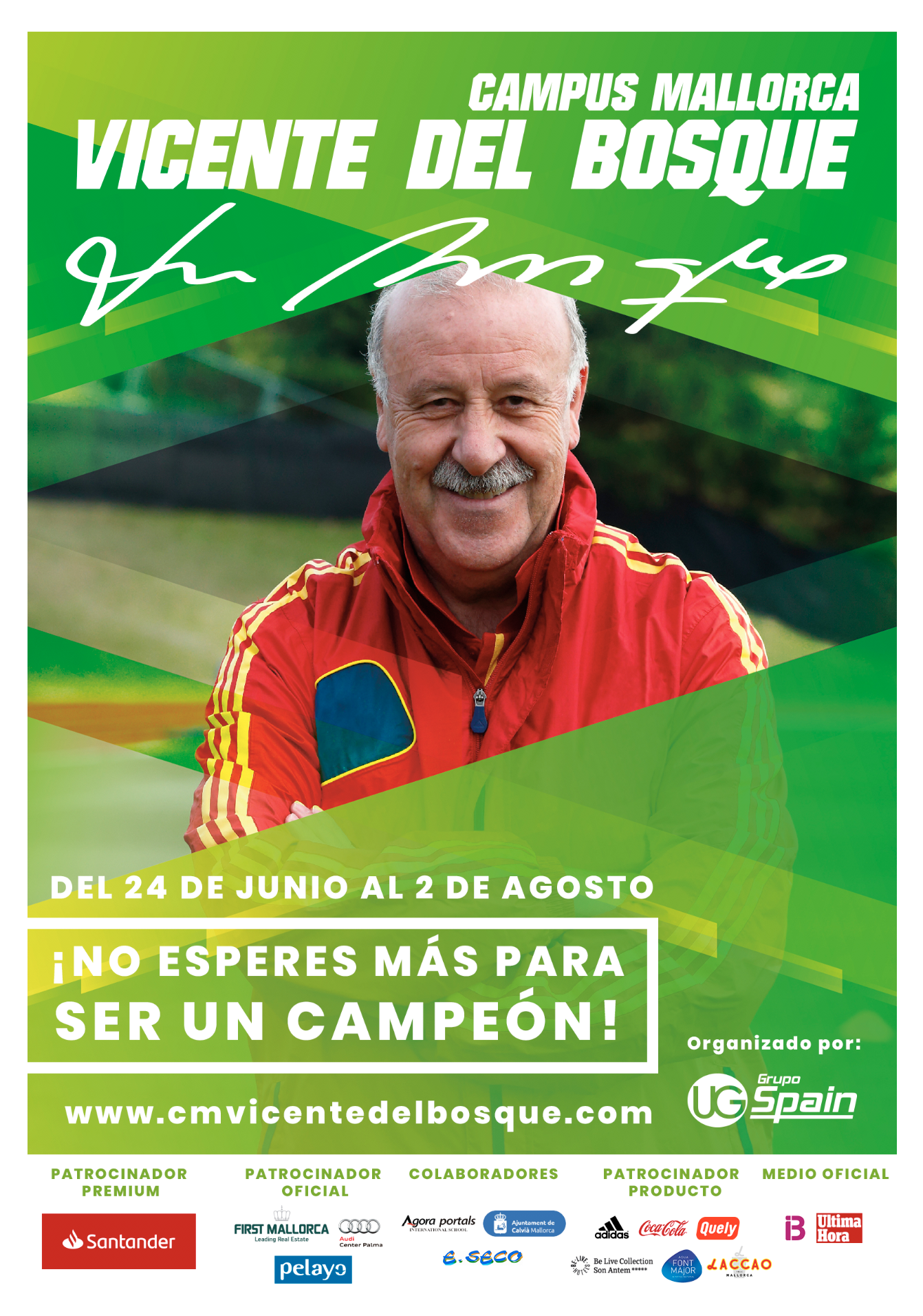 La VII edición del Campus Vicente Del Bosque Mallorca tendrá lugar del lunes 24 de junio al viernes 2 de Agosto de 2019 en las instalaciones del campo de fútbol Costa d´en Blanes en colaboración con el colegio Ágora Portals International School en el municipio de Calviá durante 6 semanas consecutivas en modalidad externo, además contamos con la modalidad interno en colaboración con el Port Olímpic Calanova.