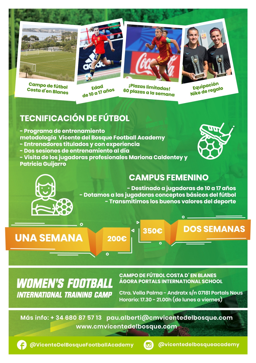 La primera edición del Campus “Women´s Football Mariona Caldentey & Patricia Guijarro” tendrá lugar del lunes 15 al 26 de julio de 2019 en las instalaciones del campo de fútbol Costa d´en Blanes en colaboración con el colegio Ágora Portals International School en el municipio de Calviá durante 2 semanas consecutivas en modalidad externo de 17:30h a 21h