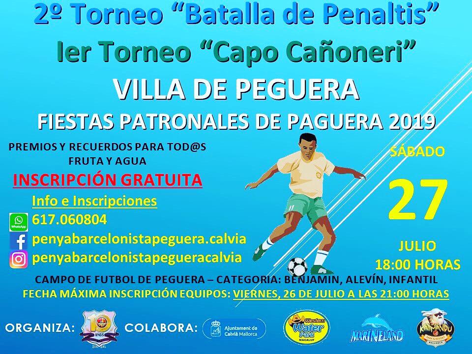 Con motivo de las Fiestas Patronales de Peguera 2019 que se celebrarán entre los días 24 al 28 de Julio de 2019, la Peña Barcelonista de Peguera (Calvià) organiza el Sábado 27 de Julio a partir de las 18:00 horas, la IIª Batalla de Penaltis y como novedad este año el Ier Torneo «Capo Cañoneri» en el Campo Municipal de Peguera » Es Pas de Ses Llebres» en sus categoría de Benjamín, Alevín e Infantil.