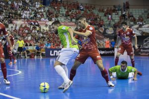Los primeros minutos fueron de tanteo entre dos conjuntos que se mostraban con mucho respeto mutuo. Las ocasiones llegaban en cuenta gotas en un inicio de partido que estuvo marcado por la lesión de Leo Santana que tuvo que salir de la cancha en camilla con claros gestos de dolor. En lo deportivo, Ximbinha y Lolo tenían las ocasiones más claras para el conjunto mallorquín en los primeros diez minutos de juego. Rebasado el ecuador de la primera mitad llegaban las mejores jugadas de la primera mitad. Primero con el Palma como protagonista. Taconazo de Lolo que dejaba solo a Raúl Campos que se estrellaba con el palo. El rechace caía en favor de ElPozo que montaba un contraataque peligroso que acababa en la cabeza de Paradynski que erró la acción más clara para los de Diego Giustozzi. Cuando parecía que el ritmo volvía a decaer el equipo de Antonio Vadillo encontraría el premio fruto a la alta presión defensiva. Los verdes recuperaban el balón en cancha de ataque,