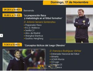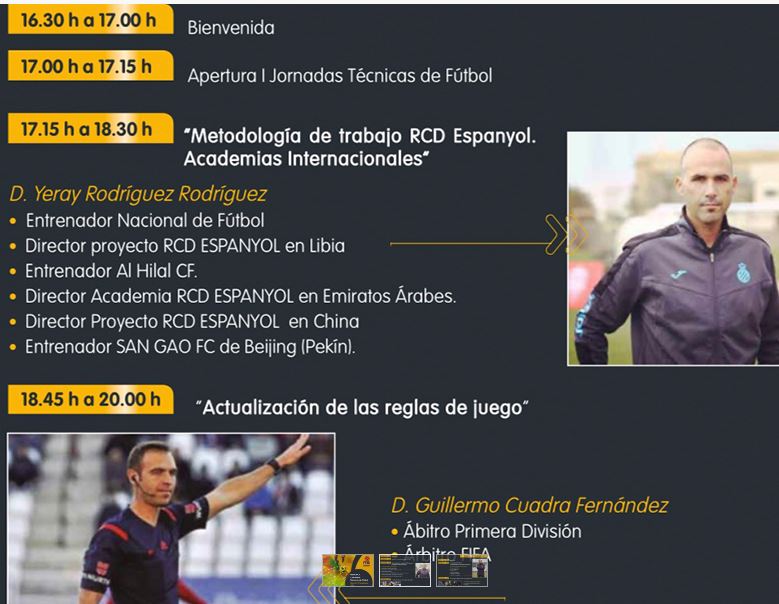 | Las jornadas arrancarán el sábado a las 17.15 horas con la clase de Yeray Rodríguez, que hablará sobre la “Metodología de trabajo del RCD Espanyol. Academias internacionales”, después de su paso por Libia, Emiratos Árabes o China trabajando para el club catalán.