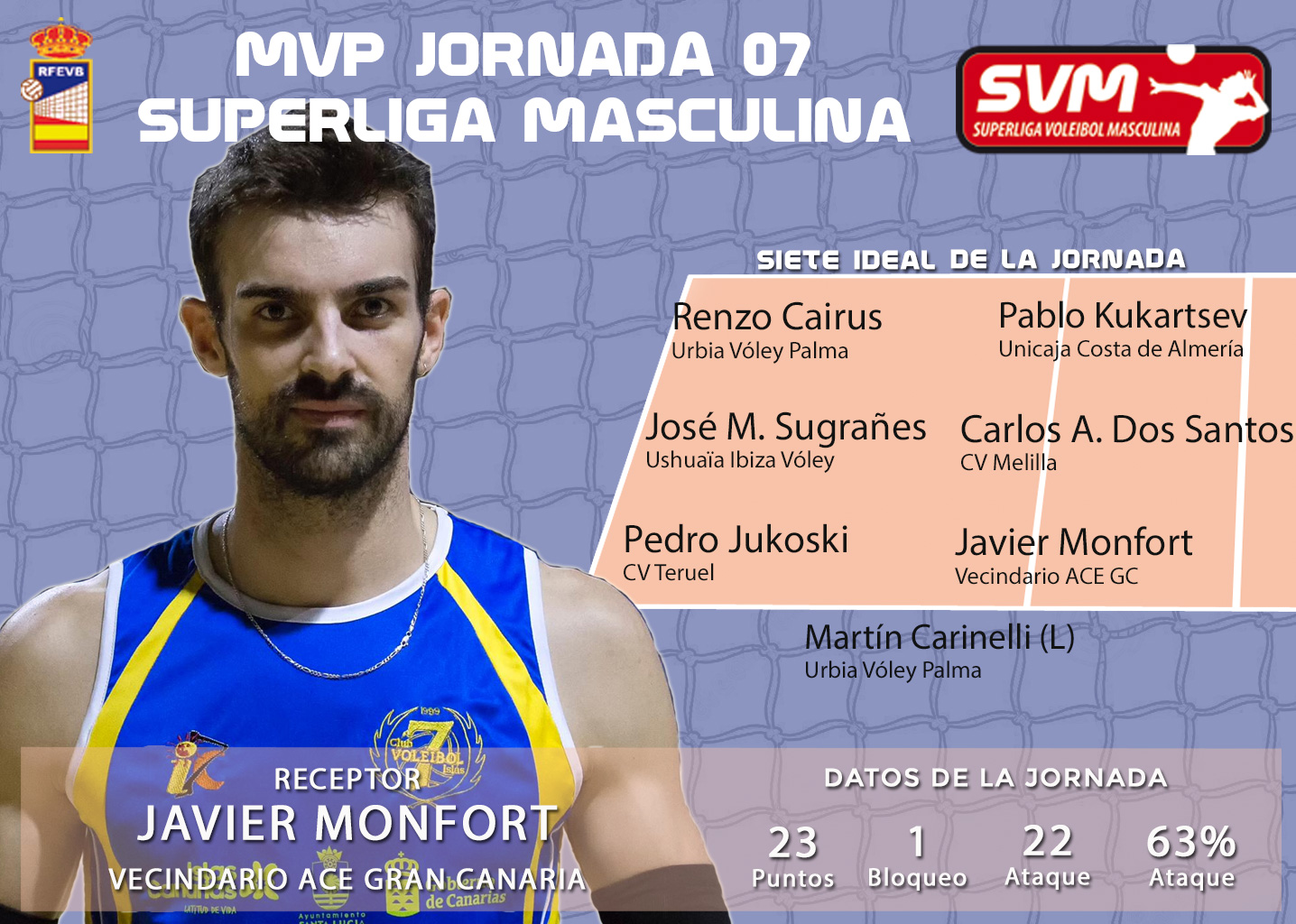 El receptor de Vecindario ACE GC Javier Monfort ha sido designado como MVP de la séptima jornada de la Superliga Masculina. El jugador llegado hace escasas semanas a la disciplina del conjunto grancanario fue decisivo en la victoria del equipo de Paco Sánchez Jover ante Arenal Emevé, cortando la buena racha de triunfos lucenses. Javier Monfort sumó 23 puntos, 22 de ellos en remate para ser el máximo atacante y segundo máximo anotador de la jornada. Urbia Vóley Palma se llevó el triunfo de la pista de Voleibol Almoradà y sitúo a dos jugadores en el siete ideal de la jornada. En labores de recepción esta Renzo Cairus y como lÃbero MartÃn Carinelli.