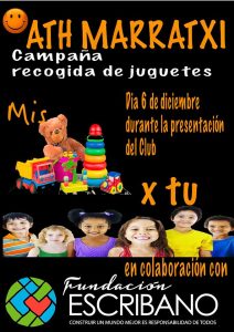 Desde el Ath Marratxi ,nos sentimos orgullosos de poner en marcha la campaña de recogida de juguetes “Mis juguetes por tu sonrisa” en colaboración la Fundación Escribano.Campaña que tendrá su día principal el 6 de Diciembre , aprovechando la Presentación de los equipos del Club.