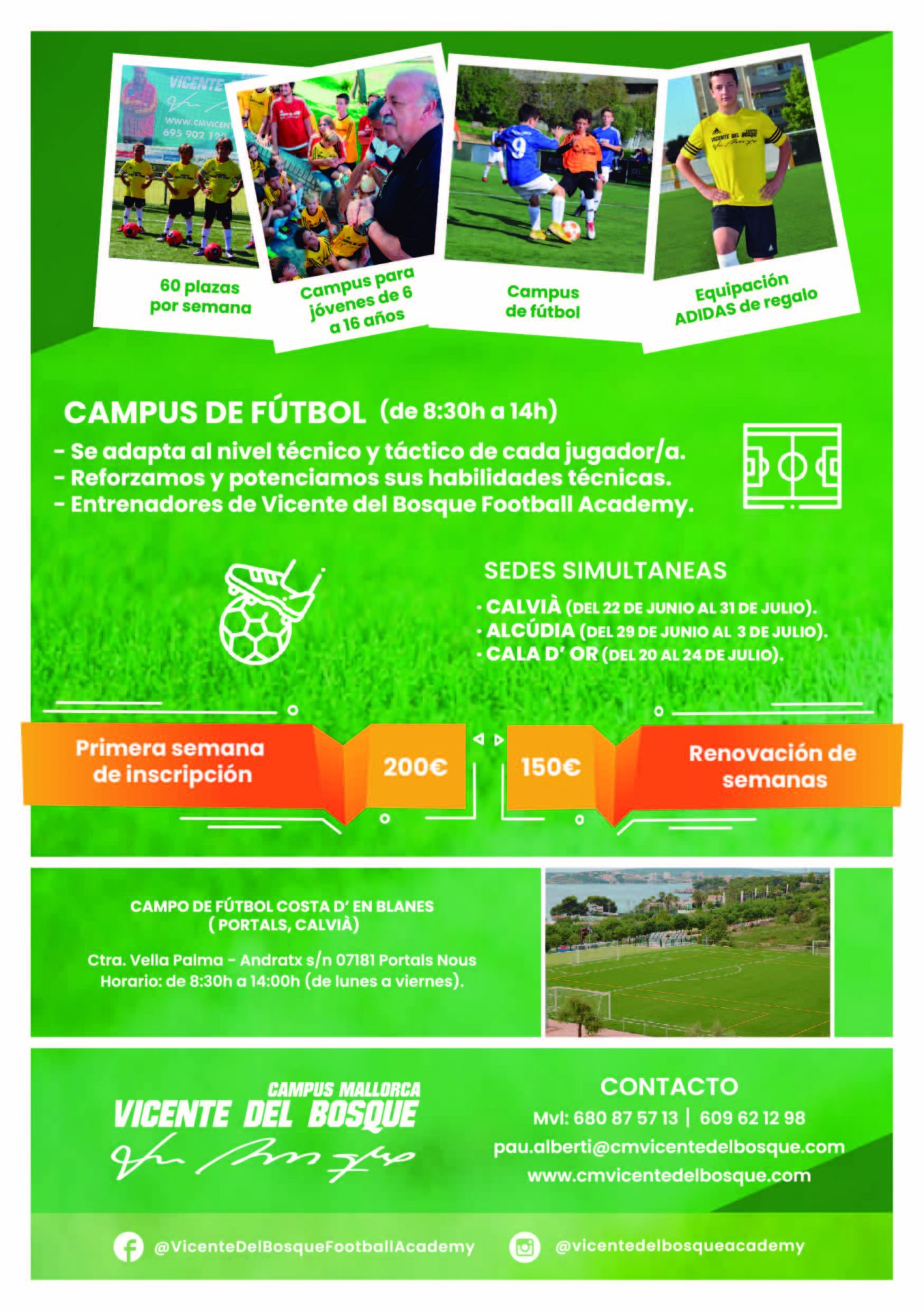 Confirmada la sede principal para la VIII edición del Campus Vicente Del Bosque Mallorca que tendrá lugar del lunes 22 de junio al viernes 31 de julio de 2020 en las instalaciones del campo de fútbol de Costa d´en Blanes (Portals, Calvià) en colaboración con el Ajuntament de Calvià y el Institut Calvianer d´esports.