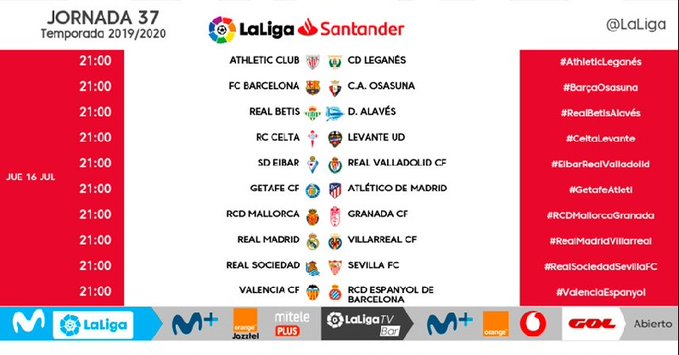 LaLiga ha dado a conocer los horarios de las jornadas 37 y 38 de LaLiga Santander 2019/20, las dos últimas de la fase regular del campeonato. La 37ª jornada de LaLiga Santander se disputará el próximo jueves 16 de julio en horario unificado, con todos los encuentros a las 21:00 horas.