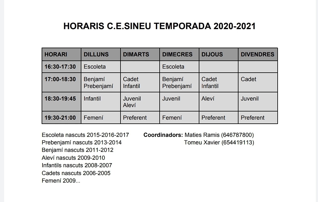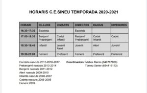 També us adjuntem els horaris de cada categoria i el protocol elaborat pel club tenint en compte les mesures del govern, sanitat, la ffib i l’ajuntament de Sineu.