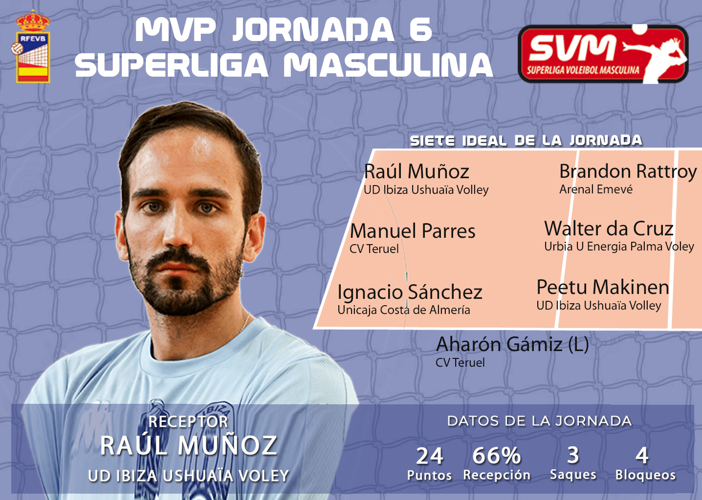 El receptor de UD Ibiza Ushuaïa Volley Raúl Múñoz es el MVP de la sexta jornada de la Superliga Masculina.