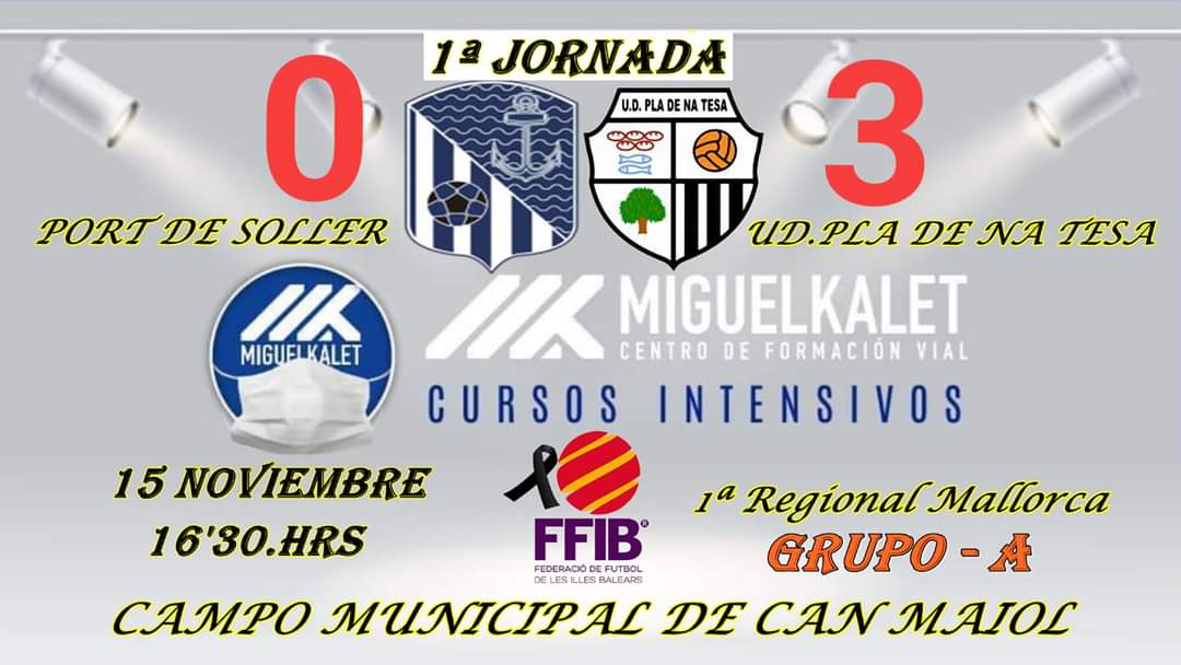 1″Jornada en la PRIMERA REGIONAL MALLORCA Grupo- A Resultado Final CF. PORT DE SOLLER – 0 UD. PLA DE NA TESA – 3 Partido donde los dos equipos dieron una buena imagen de juego siendo el equipo visitante la UD. PLA DE NA TESA puso todo su potencial y se llevaron los primeros tres puntos del campeonato. Por parte local el CD. PORT DE SOLLER que tuvieron sus ocasiones pero sin acierto y en el fútbol el que perdona lo suele pagar. Resultado justo y a esperar el partido de vuela en el Municipal de CAN GASPAR terreno de juego muy complicado de vencer y sacar puntos. Mucho tendrá que trabajar el equipo Solleric. Golas del encuentro 0-1. JUAN GOMILA HOMAR MINUTO. 35 » 0-2. JUAN ESCANDELL MINUTO. 42″ 0-3. JUAN ESCANDELL MINUTO. 62″