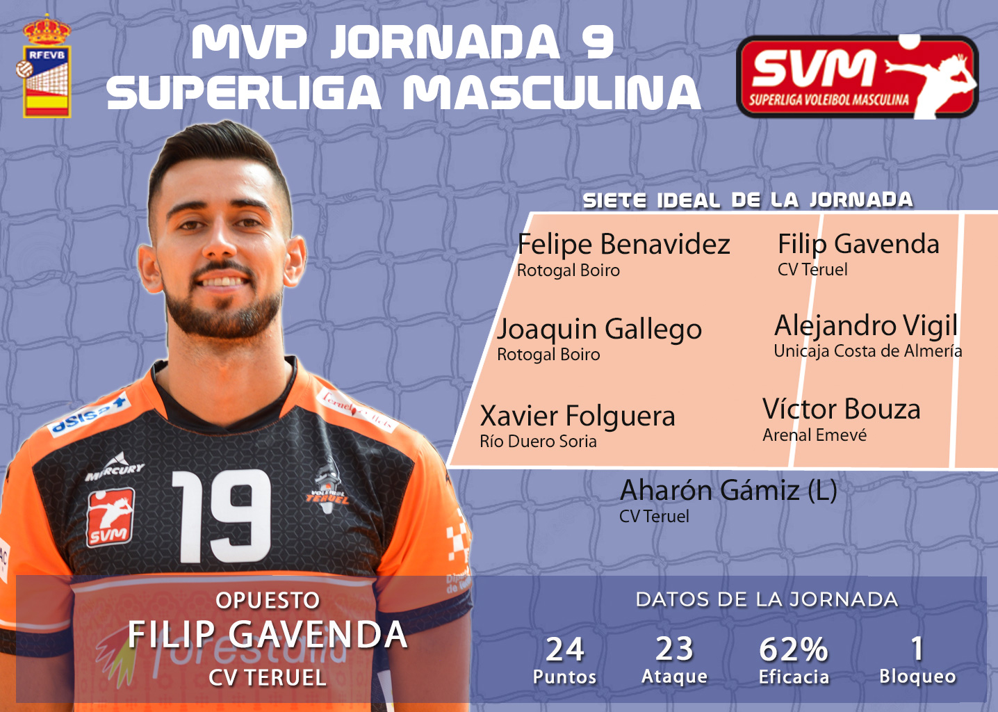 El opuesto de CV Teruel Filip Gavenda es el MVP de la novena jornada de la Superliga Masculina. El eslovaco firmó unos espectaculares números en la victoria turolense ante CV Guaguas en un choque clave por el liderato de la competición. El opuesto sumó 24 puntos, 23 de ellos en ataque, con un bloqueo y un sensacional 62% de efectividad en remate. El jugador del conjunto dirigido por Miguel Rivera está acompañado en el siete ideal por Aharón Gámiz, el más destacado en la demarcación de lÃberos con un 91% de 13 saques recibidos. Dos jugadores incluye también Rotogal Boiro en el equipo ideal de la jornada entre semana. El central JoaquÃn Gallego repite en el siete ideal con una espectacular actuación. 12 bloqueos consiguió poner en el choque ante Barça Voleibol para ser el máximo bloqueador de la jornada. Su compañero Felipe Benavidez ocupa uno de los roles de receptor gracias a sus 15 puntos y un 79% en recepción.