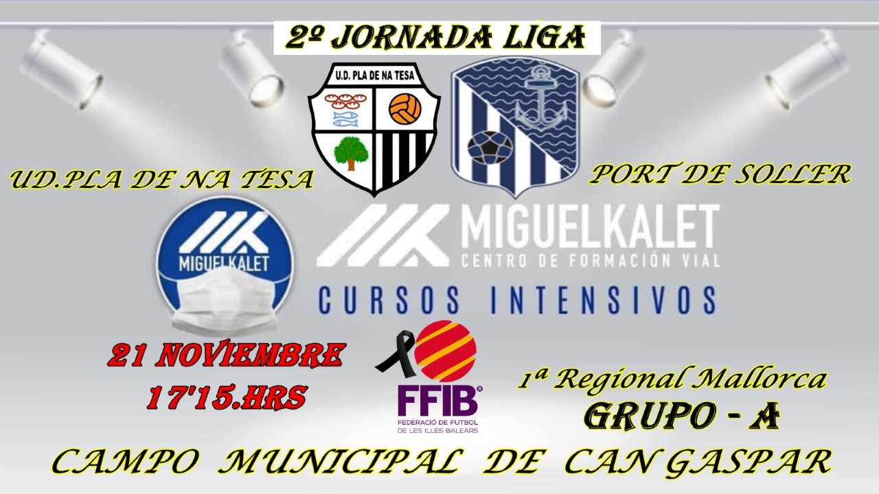Esté sábado 21 a las 17″15.Hrs la UD PLA DE NA TESA recibe en el municipal de CAN GASPAR la Segunda jornada de liga donde esperamos un gran encuentro que a priori los locales después de ganar por un claro 0-3. Espera un equipo con más ganas de revancha por parte del CF. PORT DE SOLLER que viene a un campo difÃcil de puntuar sin embargo es un equipo joven aguerrido y con ganas de sumar los primeros puntos. Ya dieron a pesar de la derrota una buena imagen.