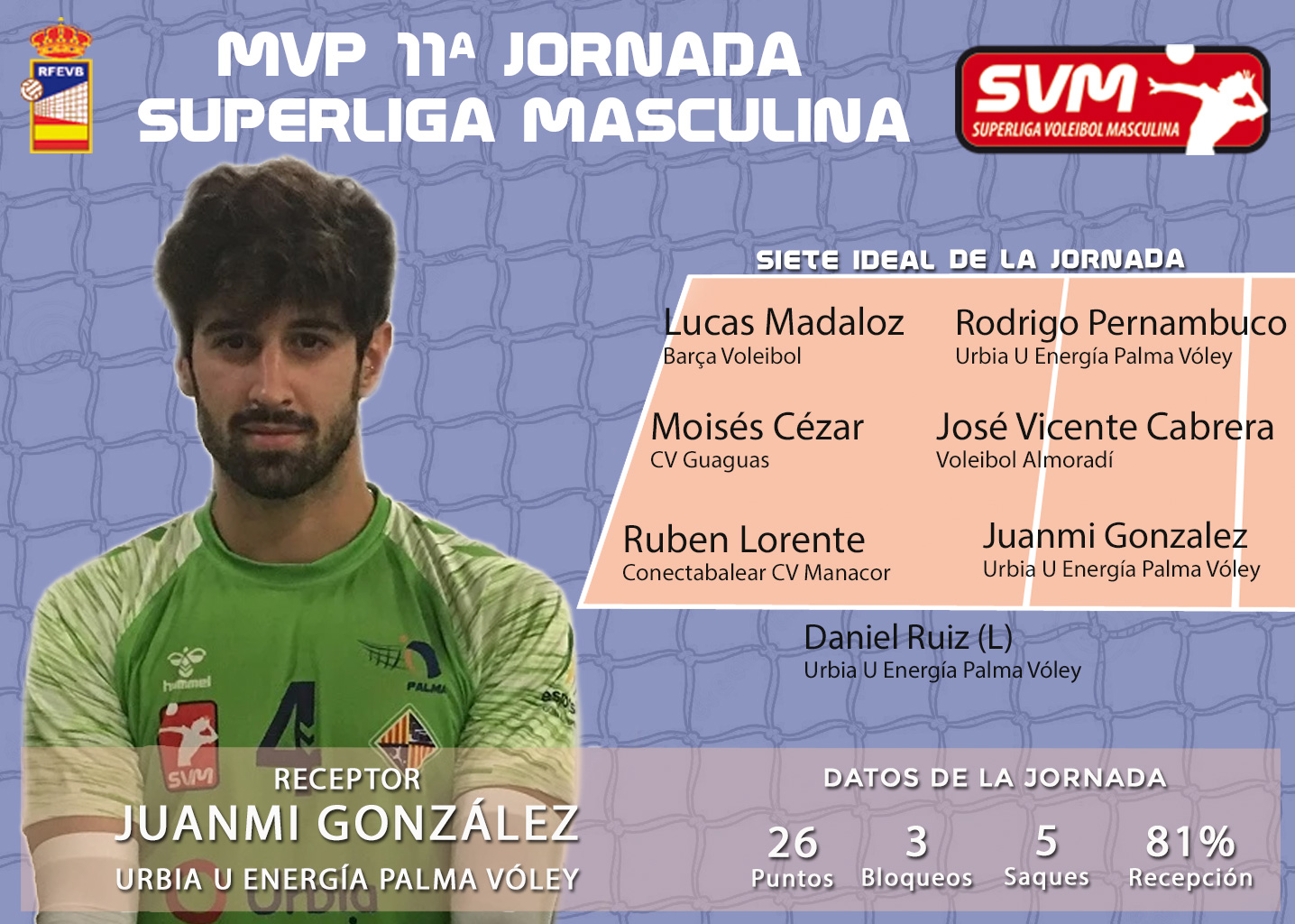 Urbia U EnergÃa Palma Vóley consiguió un espectacular triunfo en el desempate ante Unicaja Costa de AlmerÃa y tres de sus jugadores lograron un sitio en el siete ideal de la jornada, con especial presencia de Juanmi González, MVP de la jornada. El receptor onubense fue decisivo con sus 26 puntos, 5 saques y 3 bloqueos, además de un sensacional 81% en recepción que le valieron obtener el galardón. Acompañándole en el equipo de la jornada están el opuesto Rodrigo Pernambuco y el lÃbero Daniel Ruiz, el más destacado en su demarcación. Dos trabajadas victorias en el desempate dan alas a Barça Voleibol y Voleibol AlmoradÃ. Los blaugrana vencieron a RÃo Duero Soria en un choque donde Lucas Madaloz resultó determinante al igual que el trabajo en el centro de la red de José Vicente Cabrera, para el triunfo alicantino ante UD Ibiza Ushuaïa Voley.