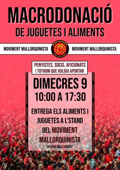preciosa iniciativa de Moviment Mallorquinista, que impulsa una macrodonación de juguetes y alimentos que estará en marcha durante todo el día de hoy, situada en las afueras del estadio de Son Moix, junto al Mallorcafé.