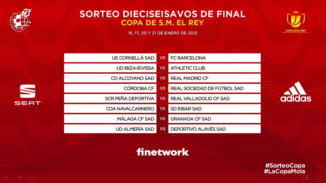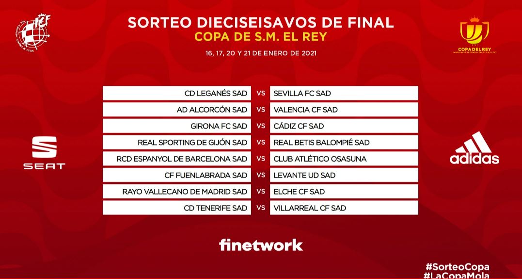 Tras una segunda eliminatoria llena de pasión, emoción y algunas sorpresas, el Campeonato de España – Copa de SM El Rey llega a los dieciseisavos de final. En este sorteo, que se celebrará en la Ciudad del Fútbol de Las Rozas, sede de la Real Federación Española de Fútbol, participarán los veintiocho vencedores de la segunda eliminatoria junto a los cuatro clubs de Primera División participantes en el torneo de la Supercopa de España (Real Madrid CF, FC Barcelona, Real Sociedad de Fútbol y Athletic Club).