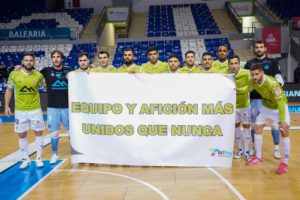 La plantilla del Palma Futsal saldrá a la pista de Son Moix y llevará una pancarta de recuerdo a su afición igual que hizo en el partido del pasado sábado frente al Pescados Rubén Burela con el lema “equipo y afición, más unidos que nunca”. Tanto el equipo como el club no se olvidan de sus aficionados en estos momentos en los que el auge de la pandemia obliga a jugar los partidos a puerta cerrada y, por tanto, prescindir del valor más importante que tiene el club como es la afición. El equipo lucirá la pancarta para tener presente a los aficionados de forma simbólica en el partido.