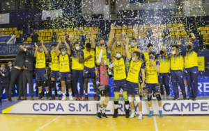 7 febrero 2021 | Por lorenzo | Categoria: PolideportivoEl anfitrión CV Guaguas se proclamó campeón de la XLVI Copa de SM el Rey al derrotar en la final a Urbia U Energia Vóley Palma por la vía rápida (25-20/25-15/25-14) en un encuentro en el que el conjunto balear acusó el esfuerzo de la semifinal ante CV Teruel. Los grancanarios dominaron el choque en todo momento, cimentando su victoria en la fortaleza de su bloqueo con Moisés Cézar y en los 20 puntos de Pablo Kukartsev, designado MVP del torneo, por su actuación en los tres días de competición en el Centro Insular de Deportes de Las Palmas de Gran Canaria, sede de la XLVI Copa de SM El Rey, veinticinco años después. Los grancanarios caminaron firmes a lo largo del choque para cerrar con contundencia el encuentro y agrandar su palmarés.