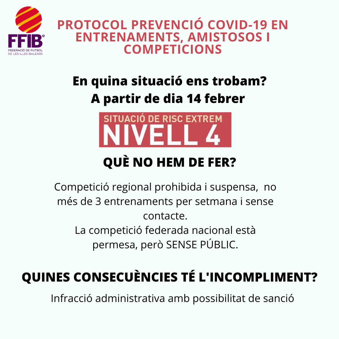 Se pone en conocimiento de los clubes de fútbol de las Islas Baleares que, dada la evolución epidemiológica, el Consejo de Gobierno de hoy viernes 12 de febrero, siguiendo las recomendaciones de las autoridades sanitarias, ha decidido PRORROGAR 15 dÃas más las medidas que se habÃan aprobado dos semanas atrás, unas medidas ya establecidas: