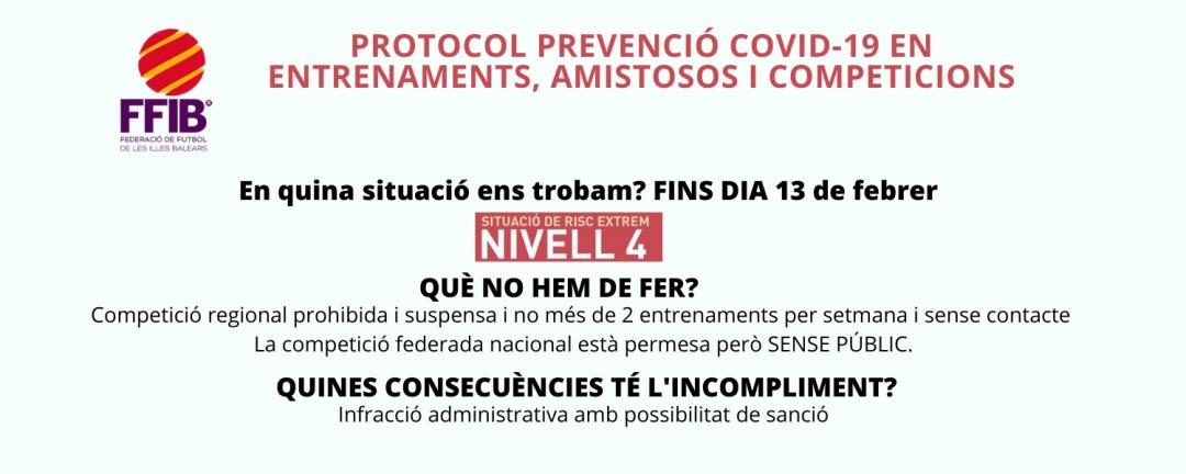 Desde la FFIB se quiere hacer un especial recordatorio que, en estos momentos y, durante toda la crisis sanitaria provocada por la COVID-19, se debe anteponer la salud de los futbolistas y todas las personas relacionadas con el mundo del futbol por encima de cualquier otra cuestión, adoptando las medidas oportunas que ya fueron establecidas en el PROTOCOLO RELATIVO A LA PROTECCIÓN Y PREVENCIÓN DE LA SALUD FRENTE AL SARS-COV-2 (COVID-19) EN ENTRENAMIENTOS, AMISTOSOS Y/O COMPETICIONES DE LA FFIB aprobado por la Direcció General d’ Esports de la Conselleria de Afers Socials i Esports.