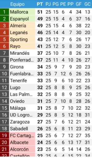 Al descanso se llego con 0-1 favorable al Almeria en la segunda parte empato el Leganes y ya superado el tiempo reglamentario los de Butarque marcarón el gol de la victoria, de esta manera asi queda la clasificación en Segunda División