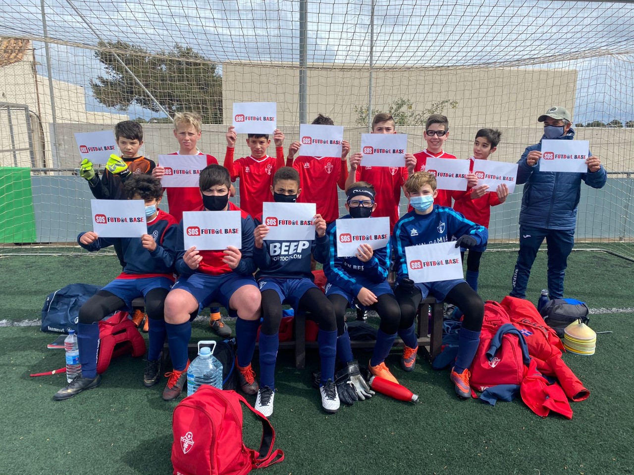 20 marzo 2021 | Por lorenzo | Categoria: Fútbol, Fútbol BaseAntes del inicio del partido de la categorÃa infantil fútbol 7 grupo B el C.D. Cala d’Or y el C.E. s’Horta, tanto jugadores, como cuadro técnico, junto al colegiado Toni Almagro Griñán han formado con el cartel #sosfútbolbase apoyando el inicio inmediato del fútbol prebenjamÃn, benjamÃn y alevÃn.