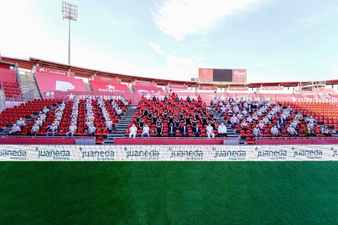 El RCD Mallorca ha organizado una foto oficial junto a 100 abonados -elegidos por sorteo-, que han acompañado al equipo con ánimos y cánticos en el momento de la instantánea. Además de abonados, staff técnico y plantilla, cinco sanitarios de Juaneda Hospitales, patrocinador oficial del RCD Mallorca, han integrado la primera lÃnea como reconocimiento a su trabajo durante la pandemia del COVID-19.