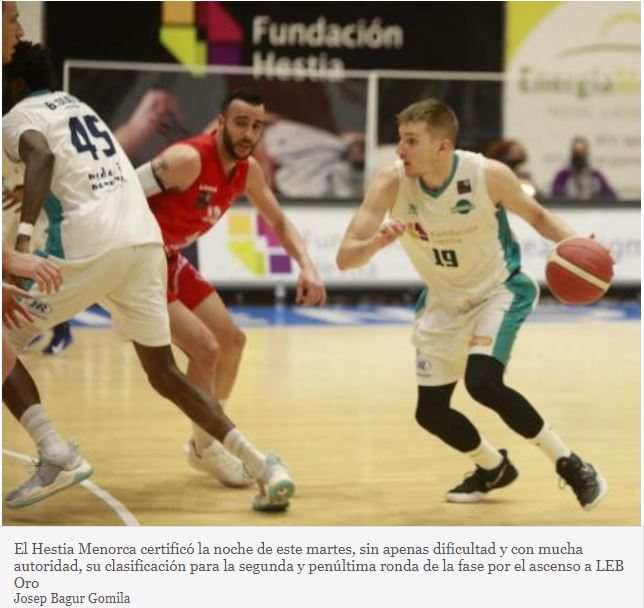 El Hestia Menorca certificó la noche de este martes, sin apenas dificultad y con mucha autoridad, su clasificación para la segunda y penúltima ronda de la fase por el ascenso a LEB Oro, en la que se medirá al Zornotza vasco, un logro que cabe valorar en su dimensión merecida, puesto que la presente es la primera incursión del proyecto insular en las eliminatorias por acceder a la segunda liga nacional y el avance de ronda se ha materializado luego de haber superado un brote de covid que afectó a casi toda la plantilla a excepción de un par de jugadores (83-63; +34 en el cómputo del cruce para el conjunto menorquÃn).