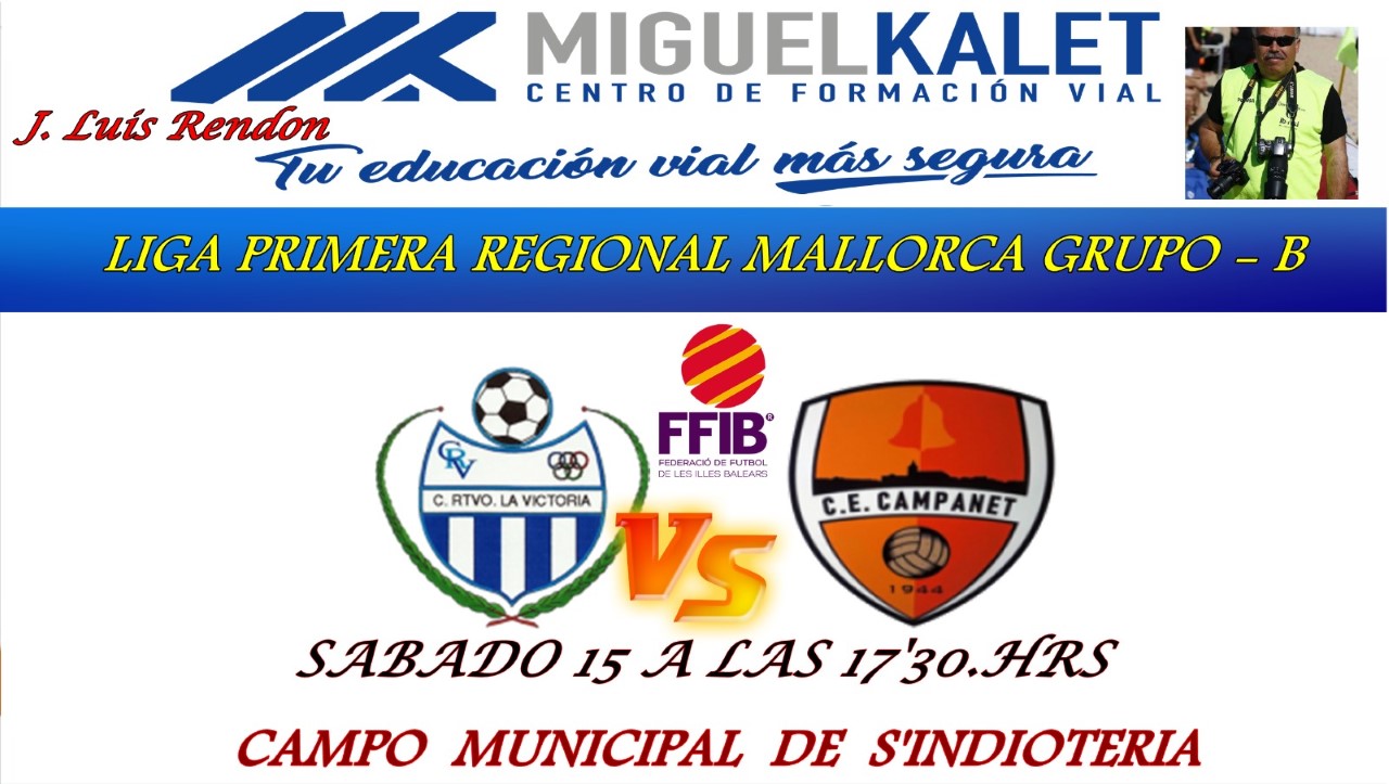 llegamos a la Jornada 8 y éste SÁBADO dia 15 A LAS 17′30.HRS tenemos un muy interesante encuentro entre dos equipos qué juegan muy bien al fútbol y con un excelente juego El RTVO LA VICTORIA recibe en S’Indioteria un campo muy complicado para puntuar el LÍDER del grupo lleva unos numeros inmejorables y una situación en la tabla de la clasificacion que esperan seguir sumando Otra victoria jornada tras jornada. Por su parte el equipo visitante y ultimo clasificado del campeonato el CLUB ESPORTIU CAMPANET intentará poner mas dificil que en su campo ya que en su feudo es un equipo potente con una gran defensa y un buen ataque. Esperamos un buen partido y alli estaremos para contar lo que suceda.