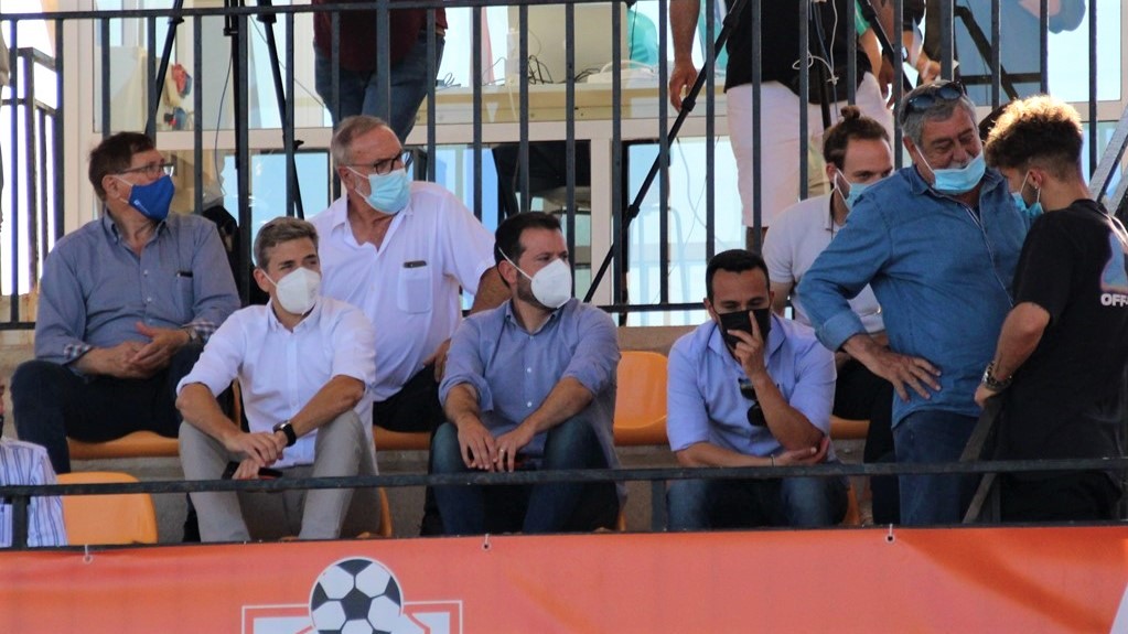 El palco de autoridades se llenó de la plana mayor del RCD Mallorca. Allí se encontraban el CEO de Negocio del club, Alfonso Díaz, junto al director deportivo Pablo Ortells, y demás integrantes de la Secretaría técnica bermellona: Sergio Marty y Sergio Moya. Ortells y Moya fueron dos de los miembros de la expedición mallorquinista más solicitados. Eran continuos los saludos con futbolistas y conocidos que habían acudido al recinto deportivo. Entre ellos, el mallorquín Víctor Narro, a quien tanto Ortells como Moya conocen del Villarreal. Otra de las caras conocidas que se dejó ver por Magaluf fue Pablo Ramón, actualmente en el Real Madrid Castilla. El defensa mallorquín se acercó también al palco a saludar a los directivos, con especial aprecio a Francisco Galmés.