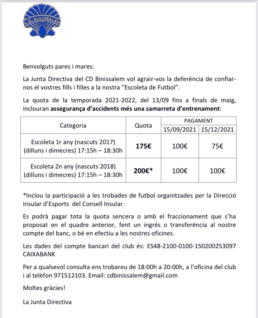 El Dia 13 de septiembre arranca de nuevo la Escoleta del CD.Binisalem y va dirigida a los jugadores nacidos el 2016 y 2017